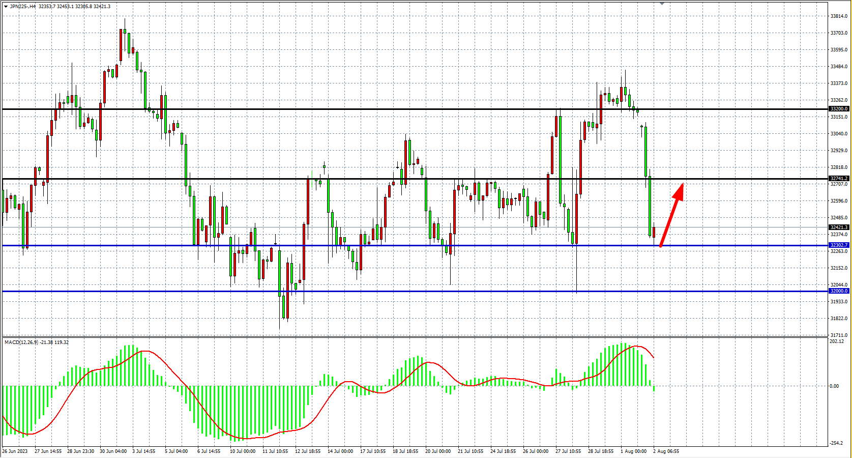 4小时图看,日经指数大幅回落至32300附近止跌,MACD量能下穿零轴,趋势再度进入宽幅整理,支撑关注32300-32000附近,阻力关注32740-33200。