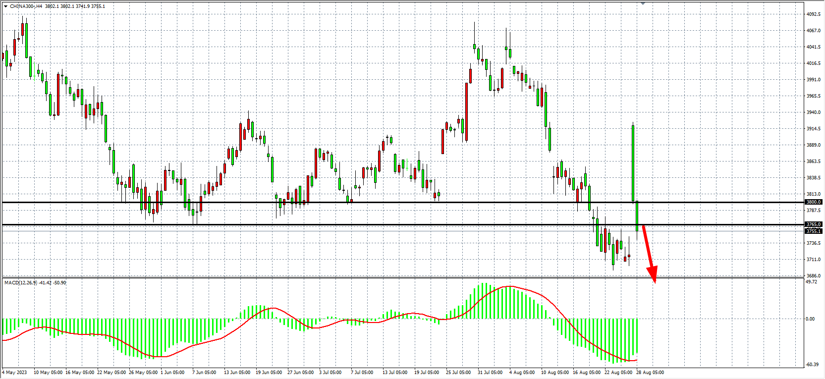 4小时图看,沪深300强势高开随后低走,MACD量能仍处在零轴下,空头趋势暂未有效逆转,阻力继续关注3765-3800。