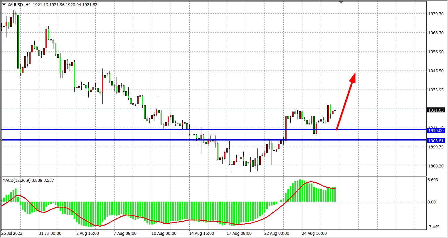 4小时图看,黄金在1903受支撑后进一步走高至1920关口附近,MACD量能在零轴上放量,短线走势仍处多头,支撑关注1910附近,阻力关注上方1930-1940附近。