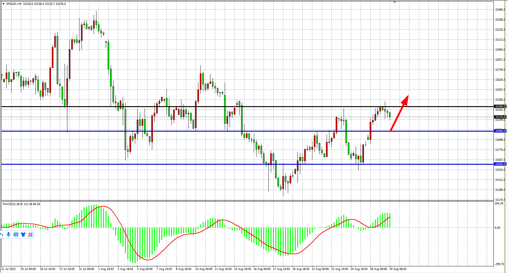 4小时图看,日经指数仍受阻于32300下方,MACD量能在零轴附近徘徊,行情进入宽幅整理,阻力关注32300附近,支撑关注31600附近。
