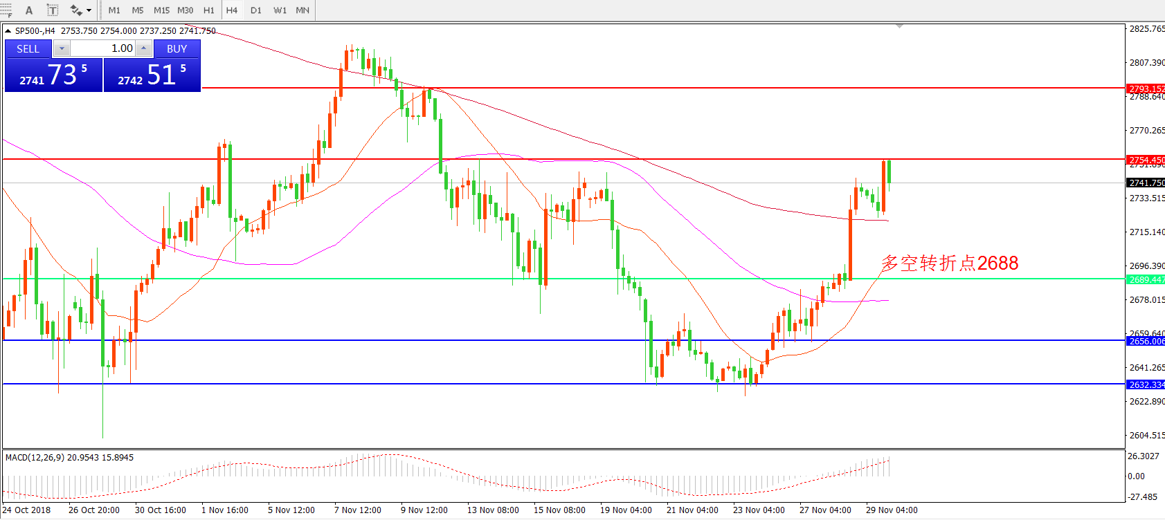 4小时图看,标普500突破阻力后快速连续拉升,前期阻力已被突破站稳,短期走势偏强, MACD红柱增加,短期以逢低做多操作为主。
