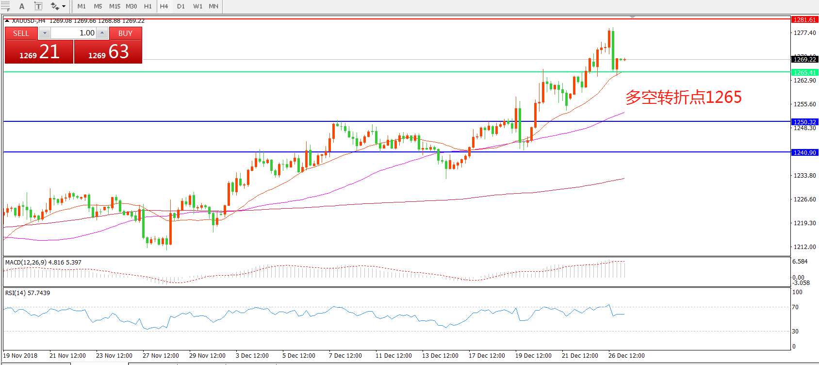 现货黄金周三(12月26日)由涨转跌,美市盘中最低触及1264.26美元/盎司,美元美股出现报复性大幅反弹,道指涨幅逾千点,创史上最大单日涨幅,三大股指涨幅均超4%,市场避险情绪有所消退,但此前的市场风险依然未能接触,中期看金价仍处于上涨趋势之中。