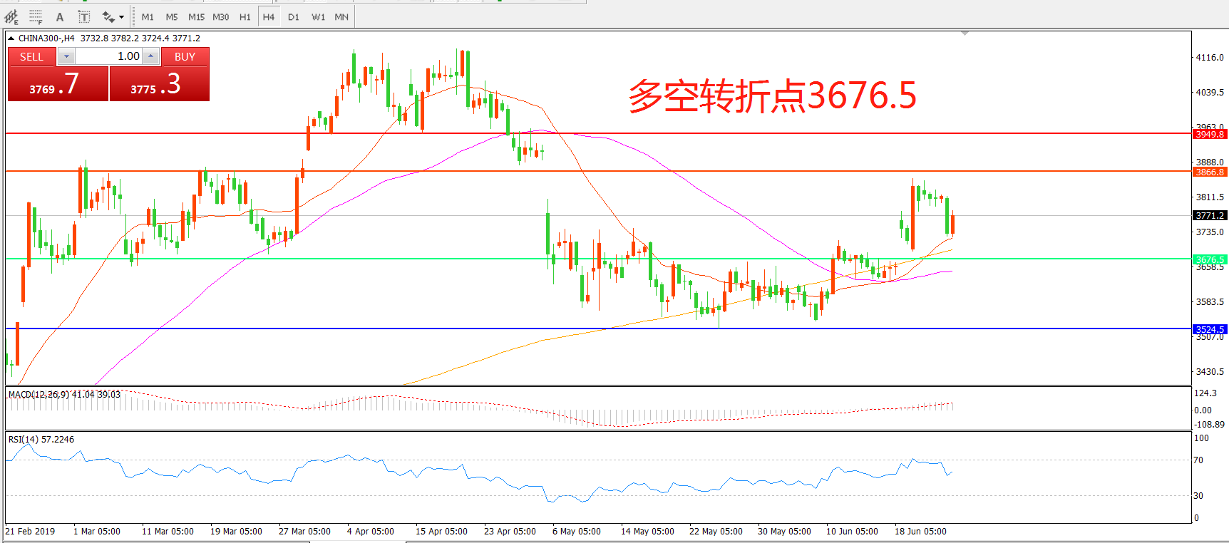 4小时图看,沪深300指数冲高后高位跳水,但整体依然处于均线支撑之上,MACD红柱增加,RSI指标拐头向上,日内延续震荡概率较大。