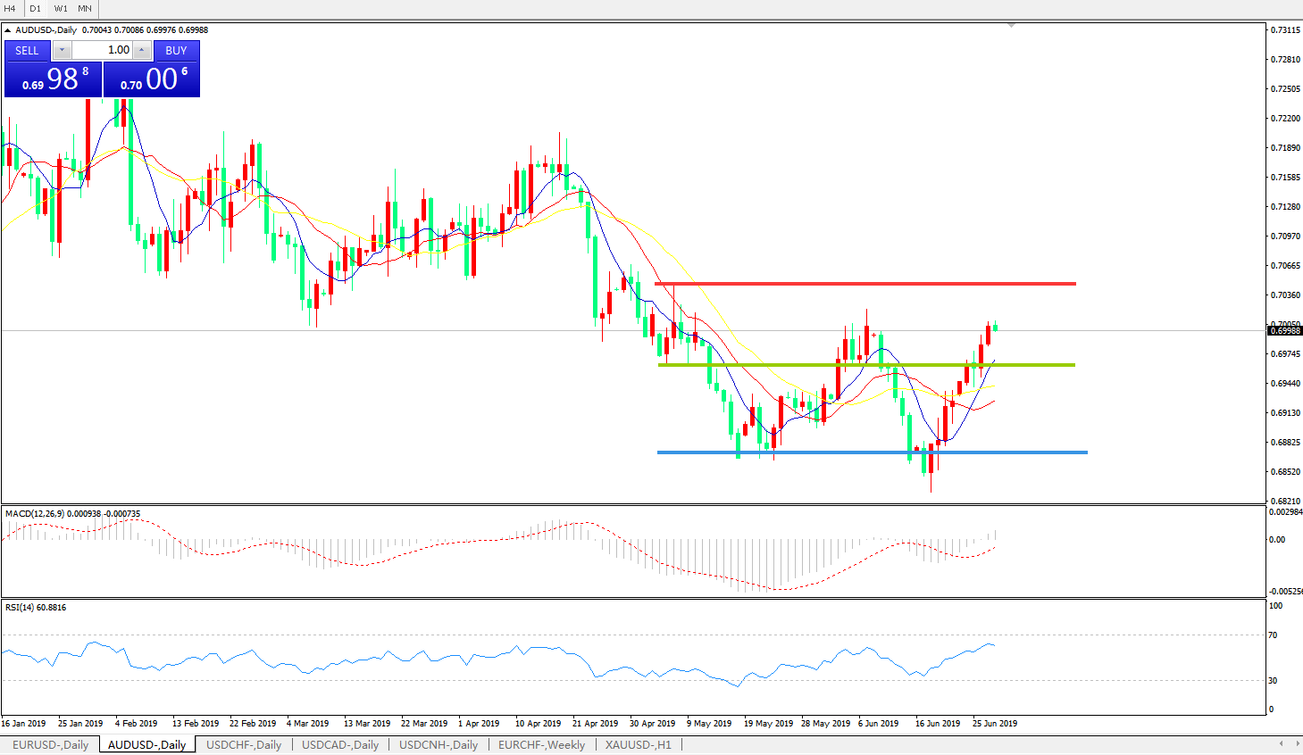 技术面简析:日图均线呈有序多头排列,汇价延续上行态势,MACD逐步逼近0轴且动能柱0轴上方放量,RSI逐步反弹走高,汇价站上0.70关口,短线料将继续上行,重点关注0.7020关口压制。