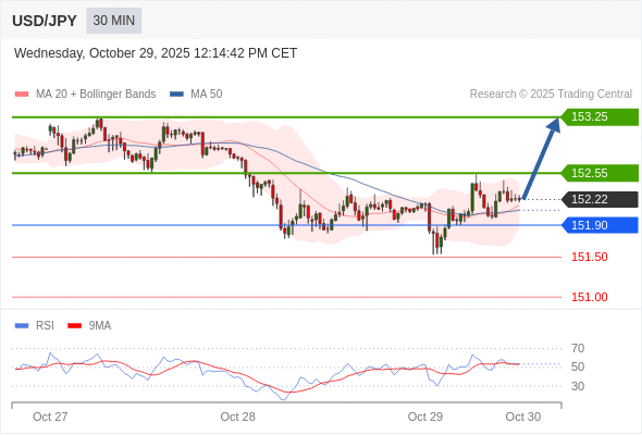 在 151.90 之上,看涨,目标价位为 152.55 ,然后为 153.25 。