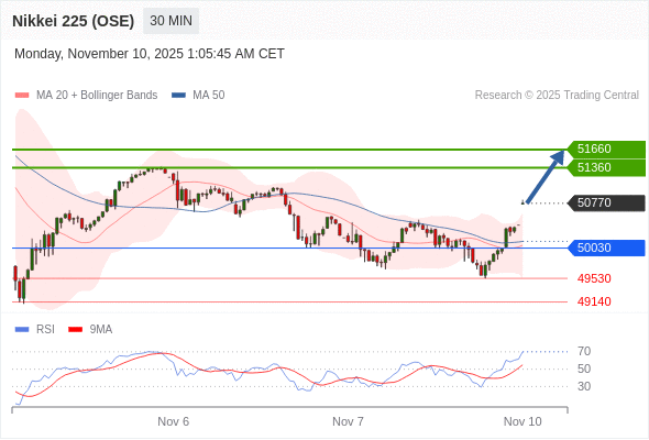 在 50030 之上,看涨,目标价位为 51360 ,然后为 51660 。