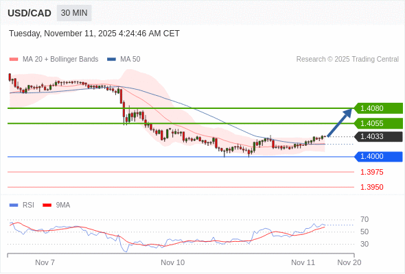在 1.4000 之上,看涨,目标价位为 1.4055 ,然后为 1.4080 。