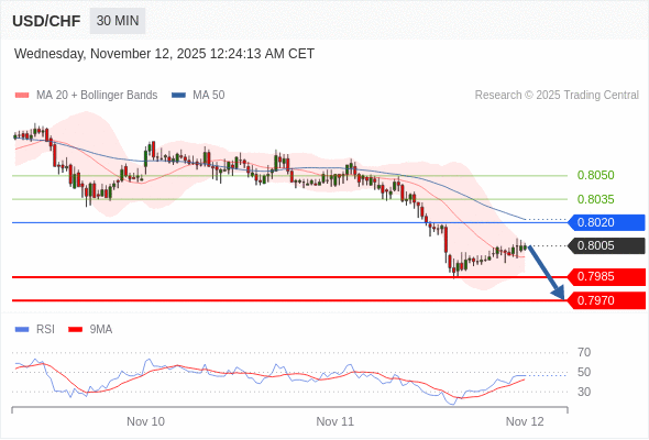 美元/瑞郎 当日内: 短期关键阻力位在0.8020。