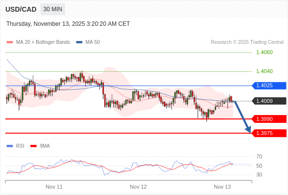 在 1.4025 之下,看跌,目标价位为 1.3990 ,然后为 1.3975 。
