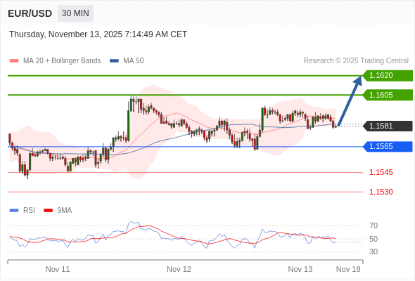 在 1.1565 之上,看涨,目标价位为 1.1605 ,然后为 1.1620 。