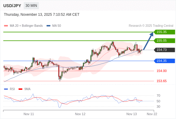 在 154.35 之上,看涨,目标价位为 155.05 ,然后为 155.35 。