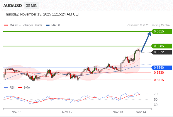 在 0.6540 之上,看涨,目标价位为 0.6585 ,然后为 0.6615 。