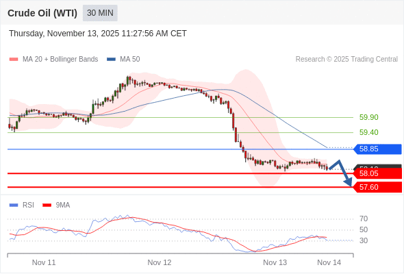 在 58.85 之下,看跌,目标价位为 58.05 ,然后为 57.60 。