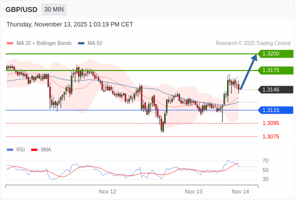 在 1.3115 之上,看涨,目标价位为 1.3175 ,然后为 1.3200 。