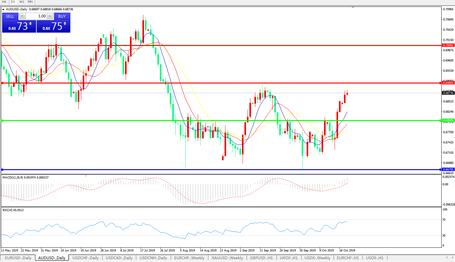交易策略:0.6800上方看涨,目标0.6900、0.7000