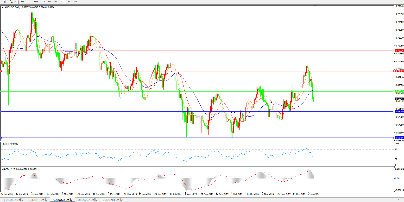 2019年年底澳元兑美元短暂突破0.70关口,随后迅速回落,因市场押注澳联储或将在下个月放松货币政策,澳元或将连续五日下跌。当前现金利率期货显示澳联储降息25个基点的几率为57%,加之美元持稳,使得澳元兑美元回落至200日均线0.6897下方。预计该货币对的下一支撑位位于100日均线和12月17日低点的0.6830-38附近,因当前市场押注澳联储降息的几率仍有上升空间,加之即将公布的经济数据或令市场失望。从技术面上来看,短期内澳元走势堪忧,若基本面保持一致,澳元兑美元或将在下个月澳联储利率决议来临前进一步走低。