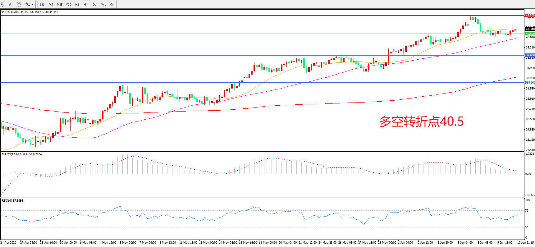 4小时图看,油价延续高位震荡,多空博弈十分胶着,40.5美元一线成为短期多空分水岭,均线系统走平,MACD红柱减少,RSI指标走平,日内延续震荡概率较大。