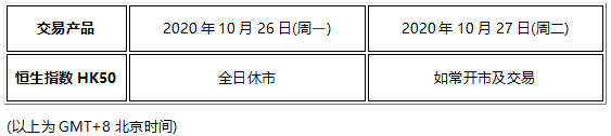 因应2020年10月26日(周一) 为香港市场重阳节假期,恒生指数HK50将于假期当日全天休市,敬请阁下留意知悉!