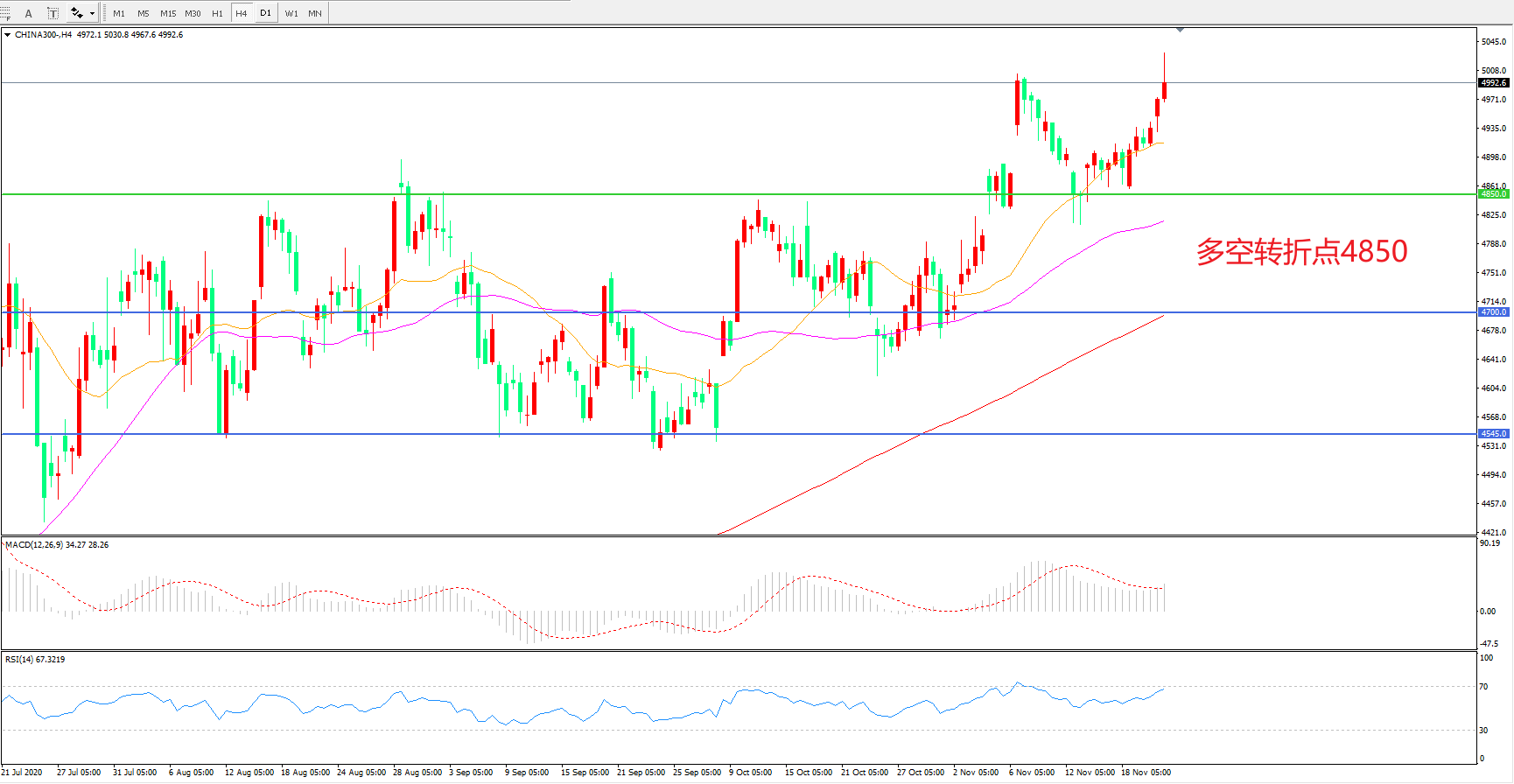 4小时图看,沪深300冲高回落,短期表现较为强势,4995成为短期阻力,MACD红柱增加,RSI指标向上,日内延续上行概率较大。