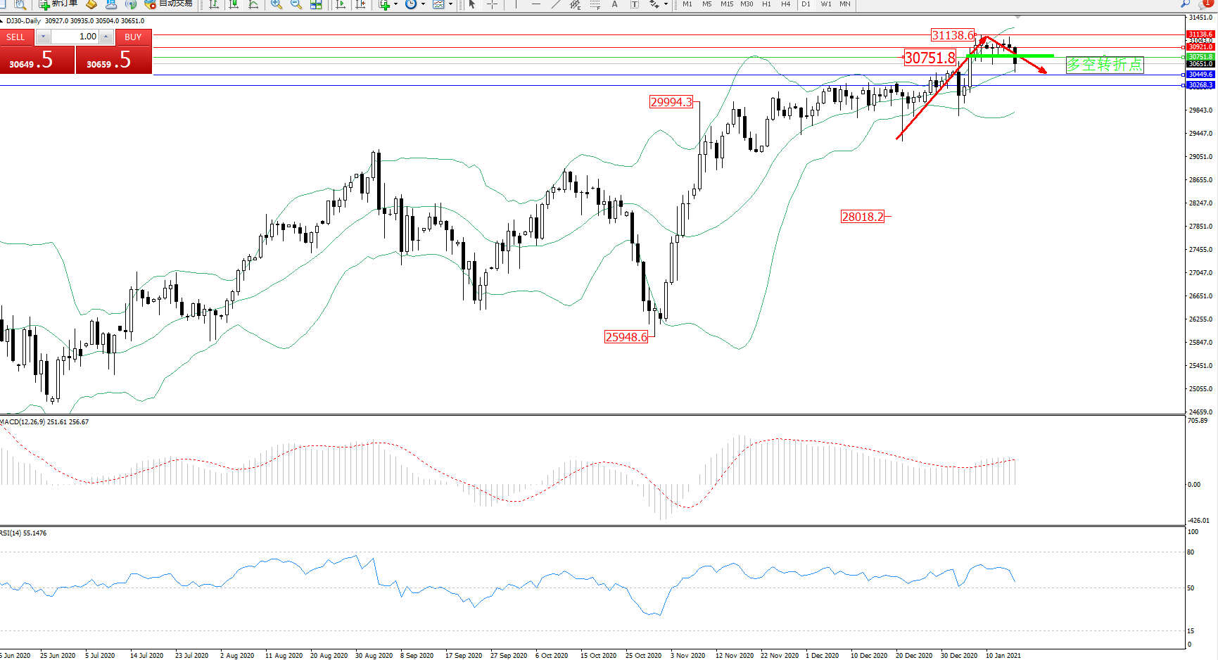 技术点评:多头动力延续布林带指标通道中上轨区间持续震荡上扬,高位抵达31138位置后短暂遇阻徘徊数日,空头动力伺机入场急速下行,触及布林带指标中轨附近节点后开始整理,布林带指标呈张口走势后开始缓慢收口中,短期回撤下行或将持续,MACD指标处于多头区域维持整理平移中,RSI指标处于多头区域维持整理平移后开始向下移动中;
