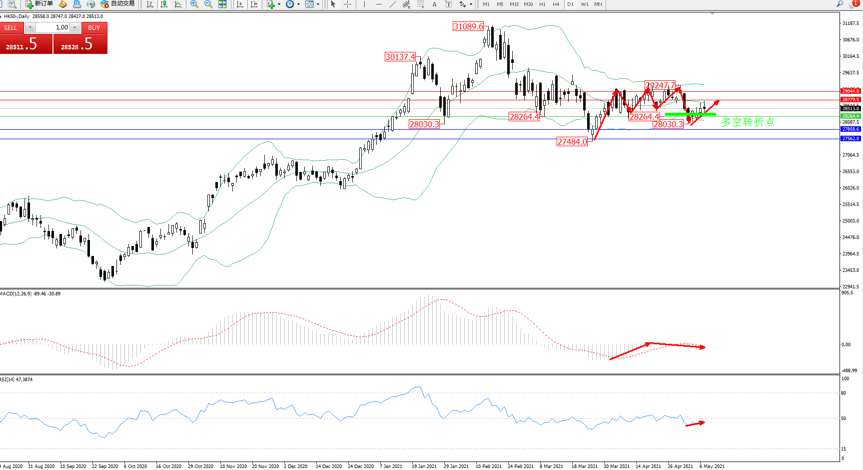 香港恒生指数5月7日(周五)收盘下跌26.81点,跌幅0.09%,报28610.65点;港股主要指数高开低走,市场情绪低迷。恒生科技指数下破所有均线,大幅收跌2.24%报7954点,大型科技股普跌,快手跌5.5%,腾讯跌近2%,美团跌1%;万国数据大跌8%为最差恒生科技成份股;大市成交额为1535亿港元,南下资金净流入14.32亿港元。南下资金今日净卖出港股3.4亿港元。净卖出前三个股为美团-W、中芯国际、药明生物,分别遭净卖出4.05亿港元、3.94亿港元、3.02亿港元。小米集团-W、舜宇光学科技、李宁净买入额位列前三,分别获净买入7.04亿港元、5.36亿港元、2.65亿港元。香港特区政府卫生署卫生防护中心7日下午公布,截至当日0时,香港新增3例新冠肺炎确诊病例,其中1例为输入性病例,1例源头不明,1例与本地个案有流行病学关联。截至目前,香港累计新冠肺炎确诊病例达11801例。金管局公布,香港于今年4月底的官方外汇储备资产为4906亿美元,较3月底的4914亿美元减少8亿美元。今年4月底并无未交收外汇合约(3月底为5亿美元)。为数4906亿美元的外汇储备资产总额,相当于香港流通货币约七倍,或港元货币供应M3约47%。