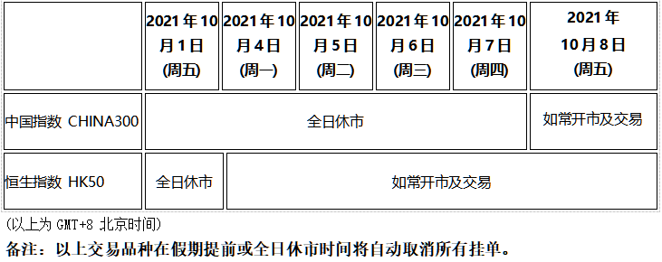 因应2021年10月1日至10月7日期间为国庆假期,本公司以下产品的交易时间将于假期期间作以下安排,敬请留意。