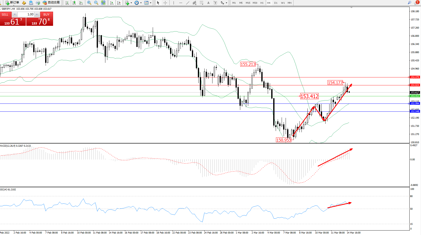 技术点评:多头动力延续布林带指标通道中上轨区间持续震荡上扬,高位抵达154.177位置节点后开始整理,多头动力拉升态势良好,短期未见最终止步迹象,布林带指标称上行趋势走势持续中,MACD指标处于多头区域维持整理不断上移,RSI指标处于多头区域维持窄幅整理缓慢上行;