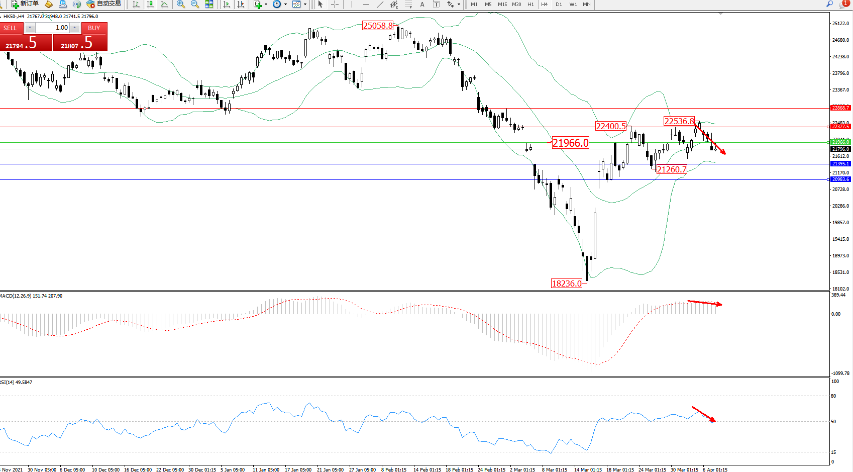 香港恒生指数4月7日(周四)收盘下跌271.54点,跌幅1.23%,报21808.98点;港股延续昨日下跌行情,权重科技股集体低迷,致恒生科技指数收跌2.48%,再度失守4500点整数关,大型科技股快手跌4.3%,百度、京东跌超3%,阿里巴巴跌超2%,腾讯、小米跌1.7%;电子烟概念股与餐饮股领跌市场,香港今日新增2644例新冠确诊(其中1368例为核酸检测阳性病例,1276例是快速检测阳性病例),第五波疫情至今累计117万例病例。新增97例死亡病例,第五波共8344宗死亡病例,死亡率达0.71%。