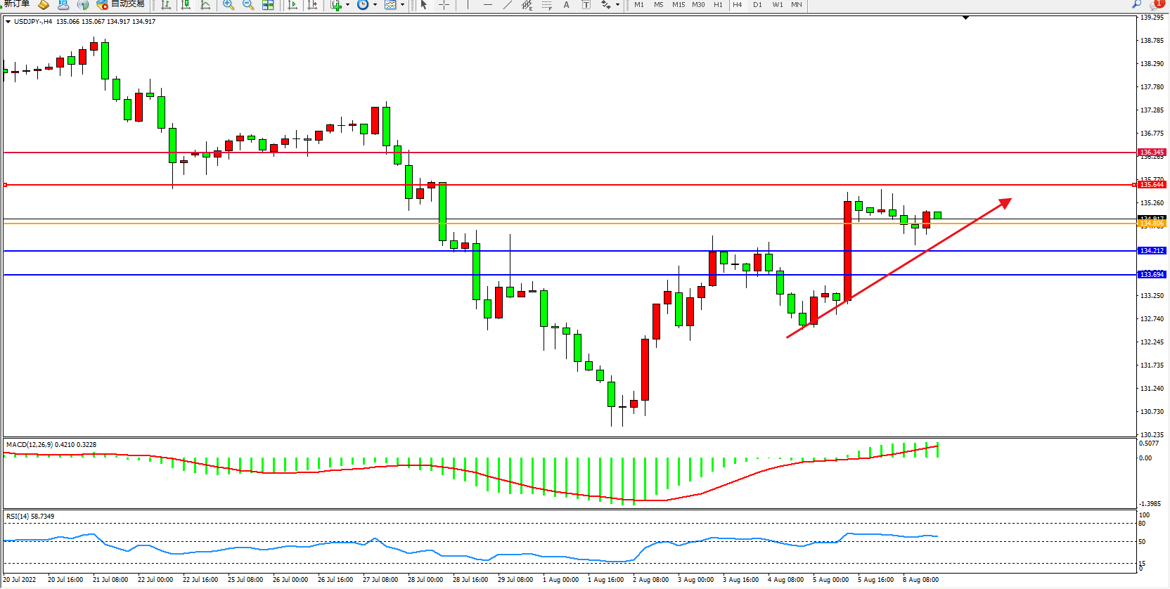 交易策略:134.806上方看涨,目标135.644、136.345