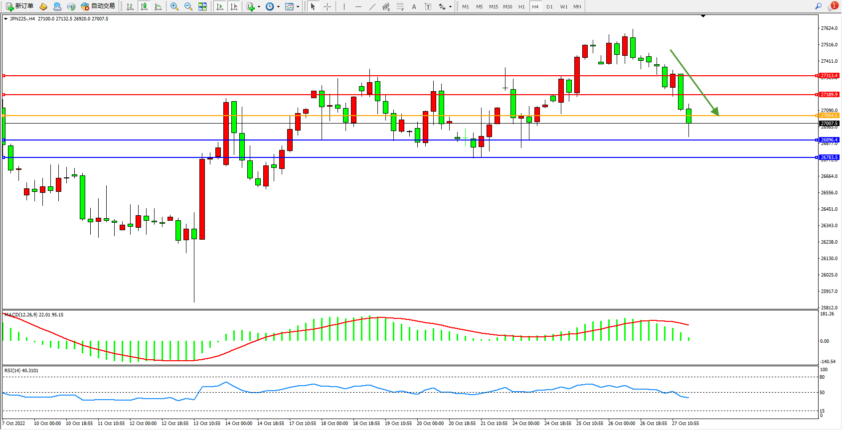 日经225指数10月27日(周四)收盘下跌106.34点,跌幅0.39%,报27325.50点。日本财务大臣铃木俊一:对于(外汇)过度的波动,我们会一直采取行动。日本政府用于经济刺激计划的支出为29.1万亿日元。