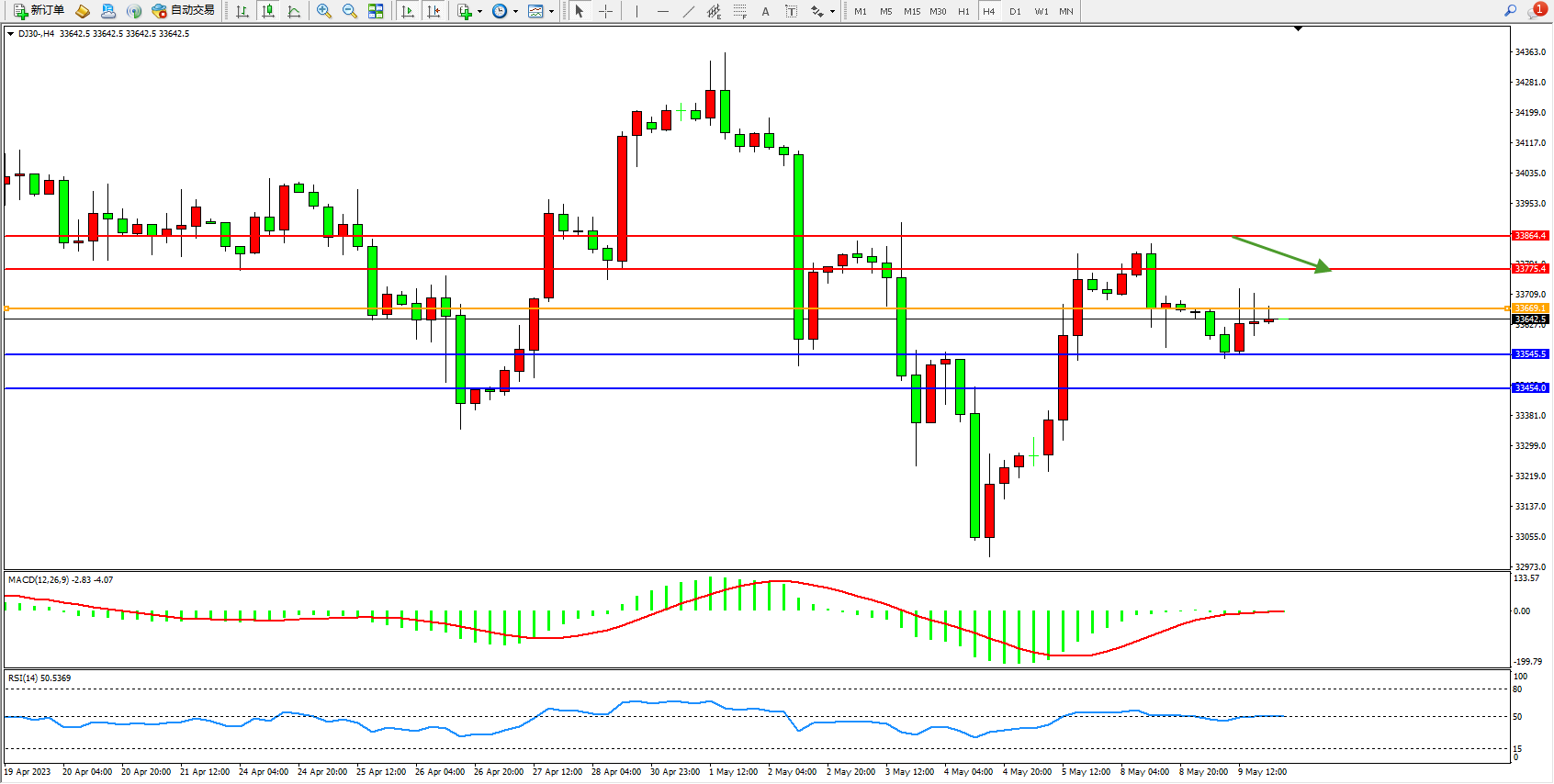 道琼斯指数5月9日(周二)收盘下跌56.55点,跌幅0.17%,报33562.14点;联邦基金利率期货显示至年底利率约为4.4%。通胀数据是否能够动摇这一定价值得怀疑。市场预计,美国4月份总体通胀率将保持在5%,核心通胀率将略微下降到5.5%。使得通胀率仍然远远高于美联储目标水平。