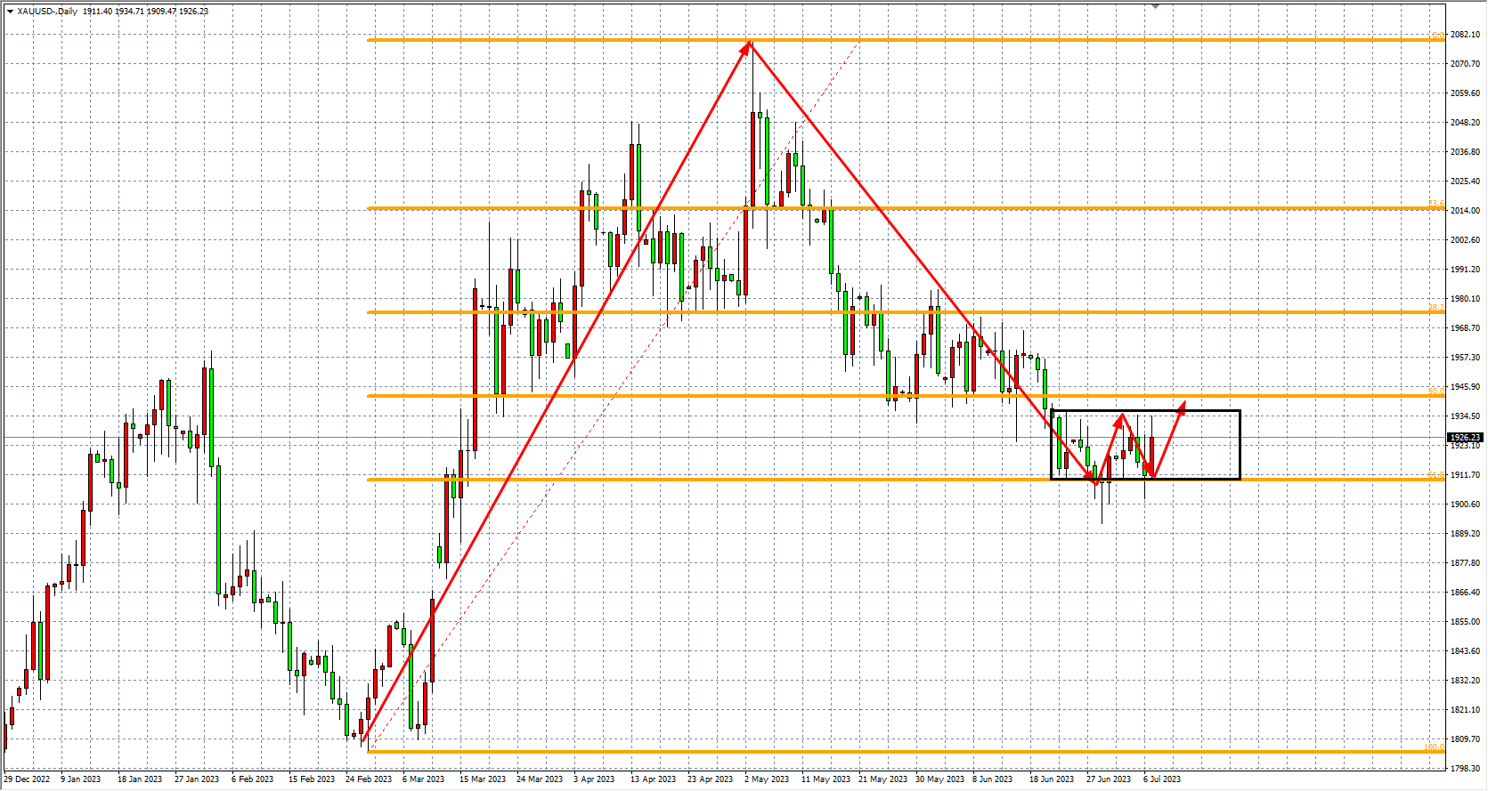 黄金日线图,价格在回落前一波(1804-2020)的上涨波段61.8%的黄金分割位(1900美元)出现明显企稳,连续两周在1900的支撑位试探却都顽强守住,近日更是出现上攻势头,该位作为中期多头防守位,后市有望就此展开反攻。上方目标暂看黄金分割50%的位置(1940),若上破则继续上看1955-1975附近,但若跌破1900关口,则趋势回归下跌,后市不排除进一步下探1880-1850。